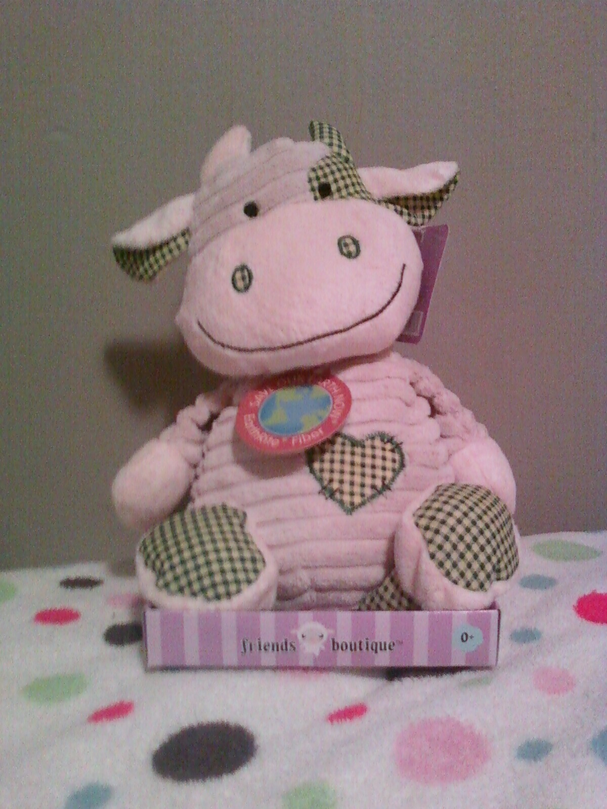 One of the best presents we found was a little stuffed cow. He's so cute and soft. It's Belly Bean's first stuffed animal. I hope it will be loved.